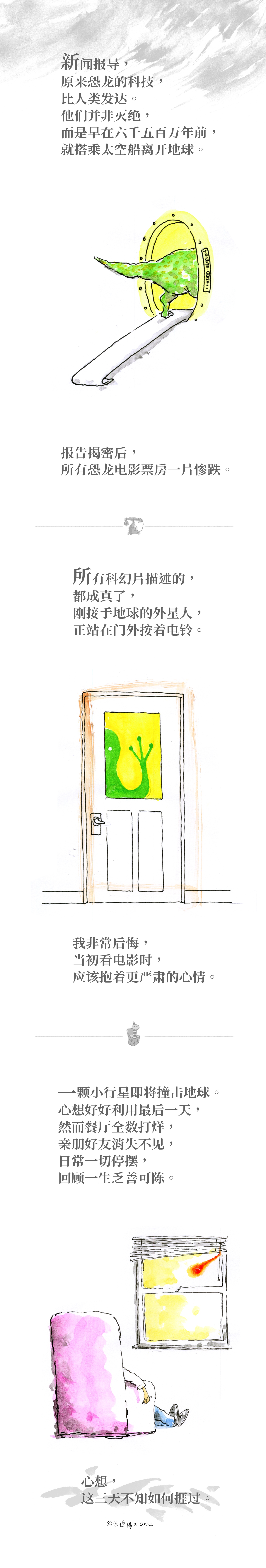 下班后,我反复回忆着脑海中那些惊人的想法。熟悉与陌生事物的重叠令人恐惧。为了验证那些想法,我不管不顾地来到了朋友家。那时正值五月,天空毫无征兆地下起了小雨。我站在一处单元楼下伸手聚集雨水,内心反而平静。没过多久,朋友就带着伞下来了。不等他开口,我就一股脑把发生的事情说了出来,包括“无线电宇宙”啦、写材料啦、项目审批啦,就连土拨鼠的入侵事件也没有遗漏。我们一边走着,雨一边下着。起初他打着伞,不知什么时候伞也撤了。他低着头,只剩下走路和点头的动作,仿佛全身上下所有注意力全用来接收我说的话了。