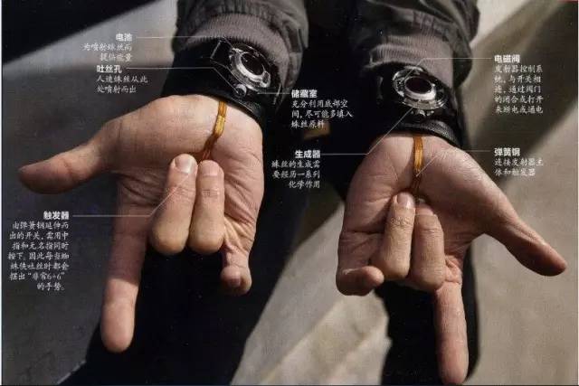 6.蜘蛛侠的蛛丝非自身产生,而是彼得·帕克自己调制的化学物,压缩于胶囊中,借助“蛛丝发射器”喷射,而且很环保,一个小时左右后能自行分解。