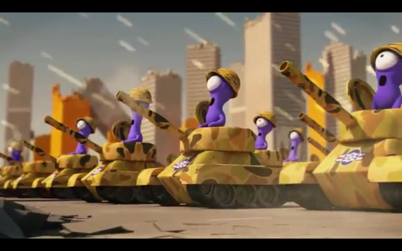 另一边,紫色小人星球的军队锁定了目标,对外来侵略者发起了攻击。