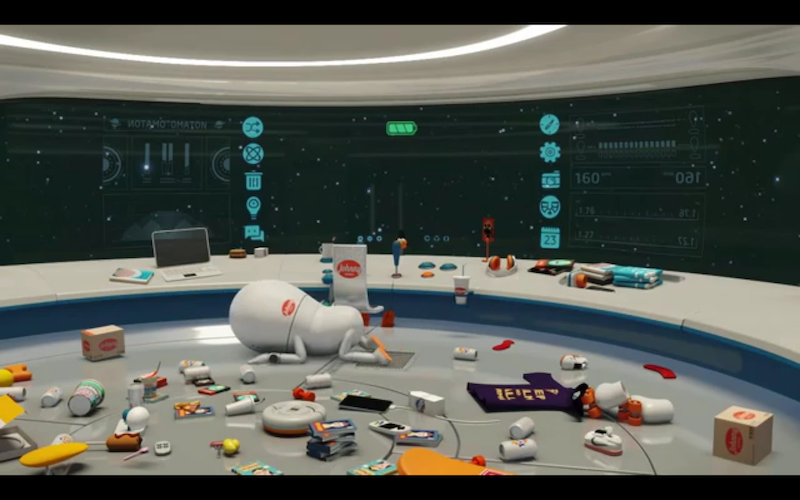 画面一转,画风突变。飞船的另一边一片狼藉,吃喝玩乐的东西堆了一地,而我们的最佳快递员,正趴在垫子上呼呼大睡。