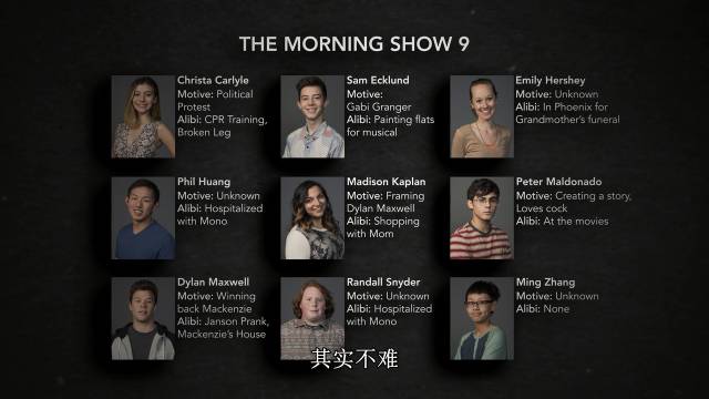 最后能证明迪伦清白的最关键证据,其实一直被迪伦的女票隐藏起来,只因为女票不想泄露自己不堪的一面。而其他人的不在场证明和对迪伦的无端猜测呢?也都有真有假。