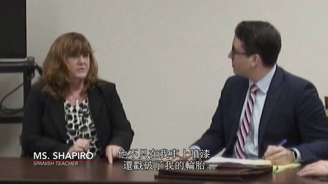 西班牙语老师夏琵洛十分肯定地说,这件事一定是迪伦干的。她声称,这些涂鸦不是随机针对一群老师,而是冲着她本人来的。因为,在被涂鸦的27辆车中,只有她一个人的车胎被扎破了。