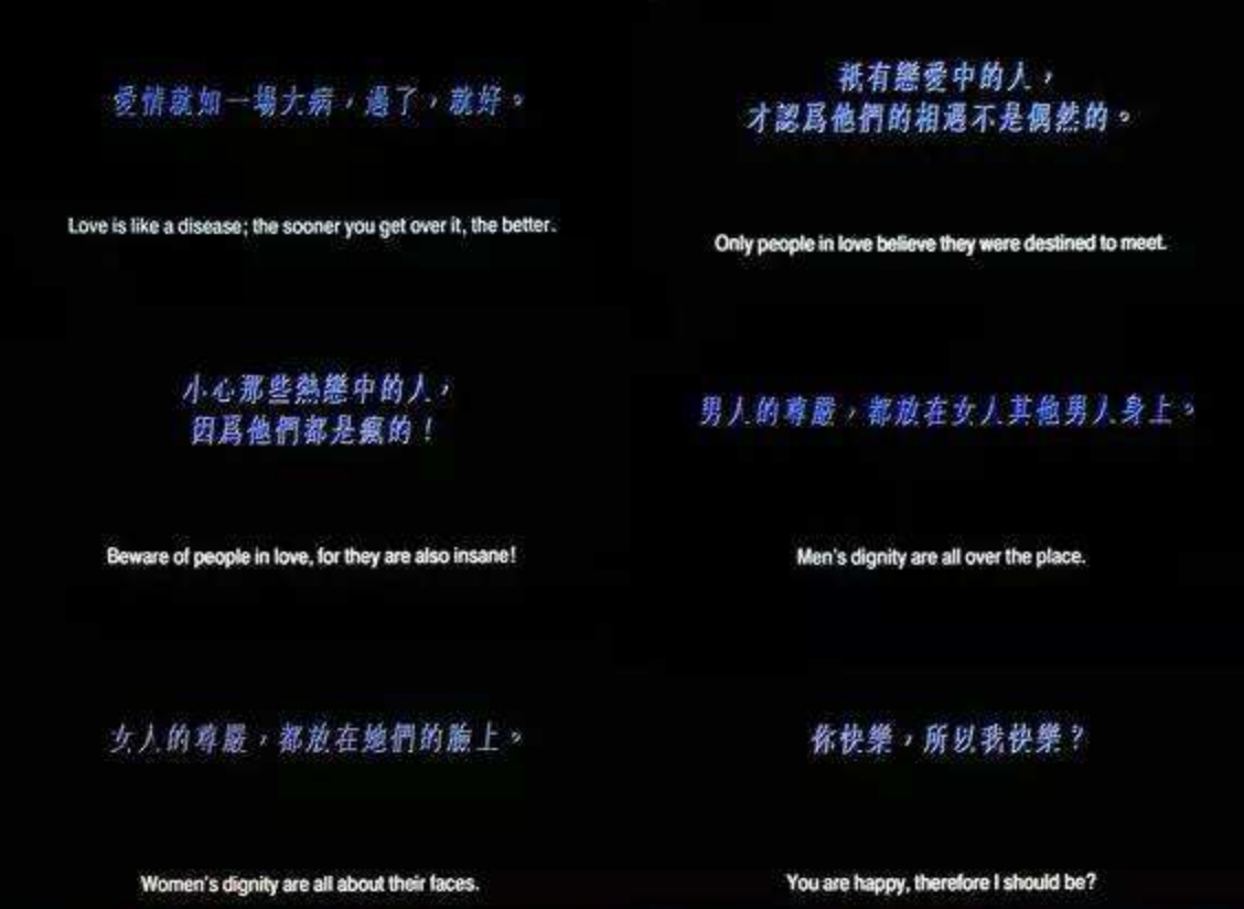 《重庆森林》里失恋的梁朝伟会和变胖的肥皂对话,和潮湿对话。而一直在等待阿May回来的金城武只能通过跑步来蒸发体内的水分。失恋的痛苦在于:对爱的热度不减,爱却已不在。Jeannie坐在楼梯上痛苦,去Alan曾经英国读书的学校旅行。