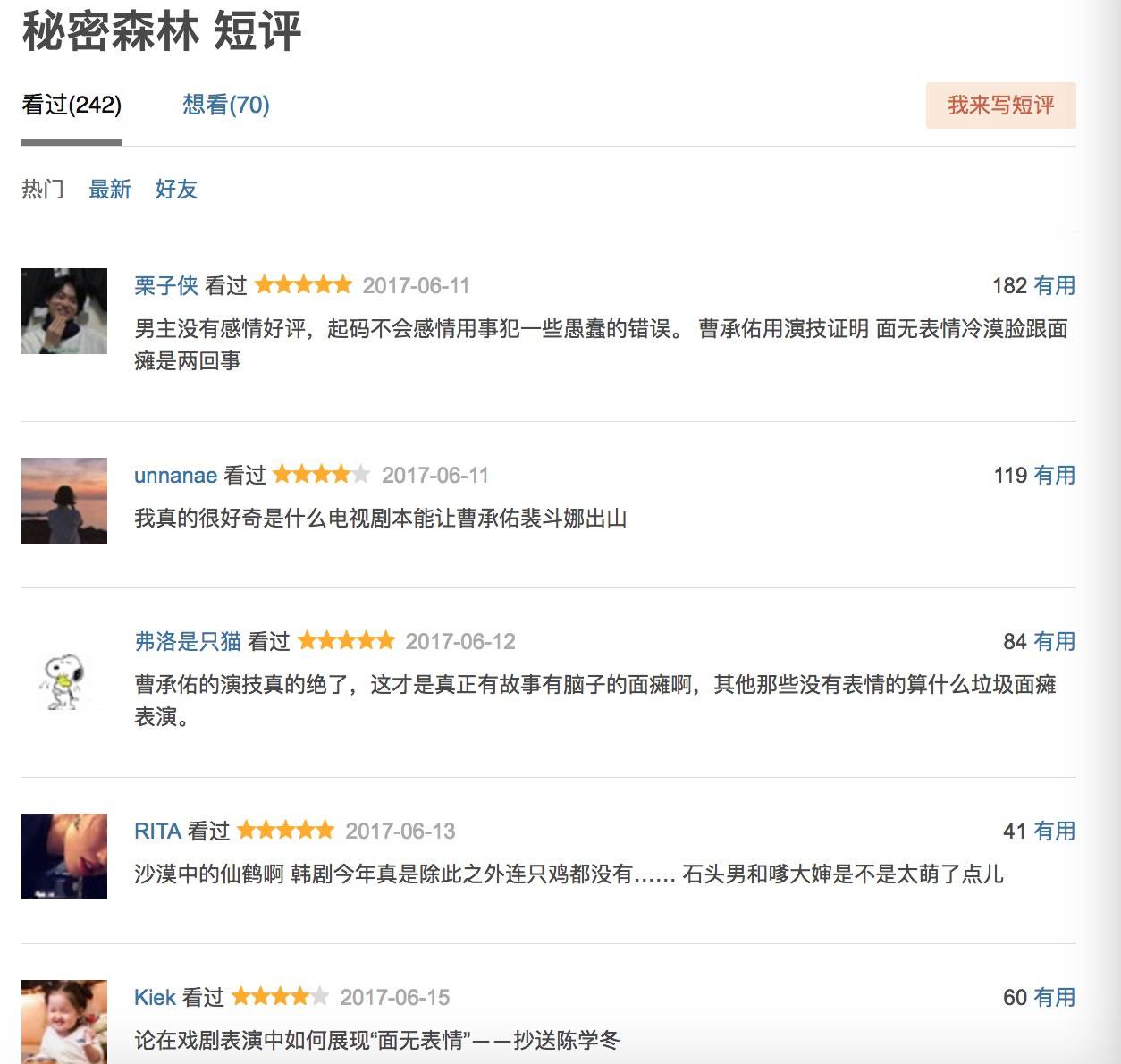 豆瓣9.1分的高分评价,曹承佑、裴斗娜等一群电影咖的加盟,都让这套剧充满吸引力,豆瓣的网友评价也非常吸引人。