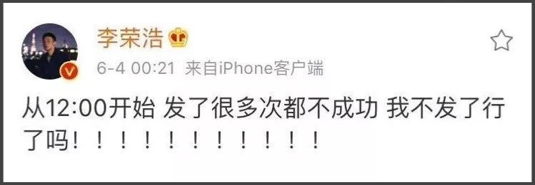 从零点开始,李荣浩心急火燎地连发了三条微博,结果都被吞了。他气不过,在线暴躁吐槽,在后面跟了11个感叹号,可把孩子急坏了!