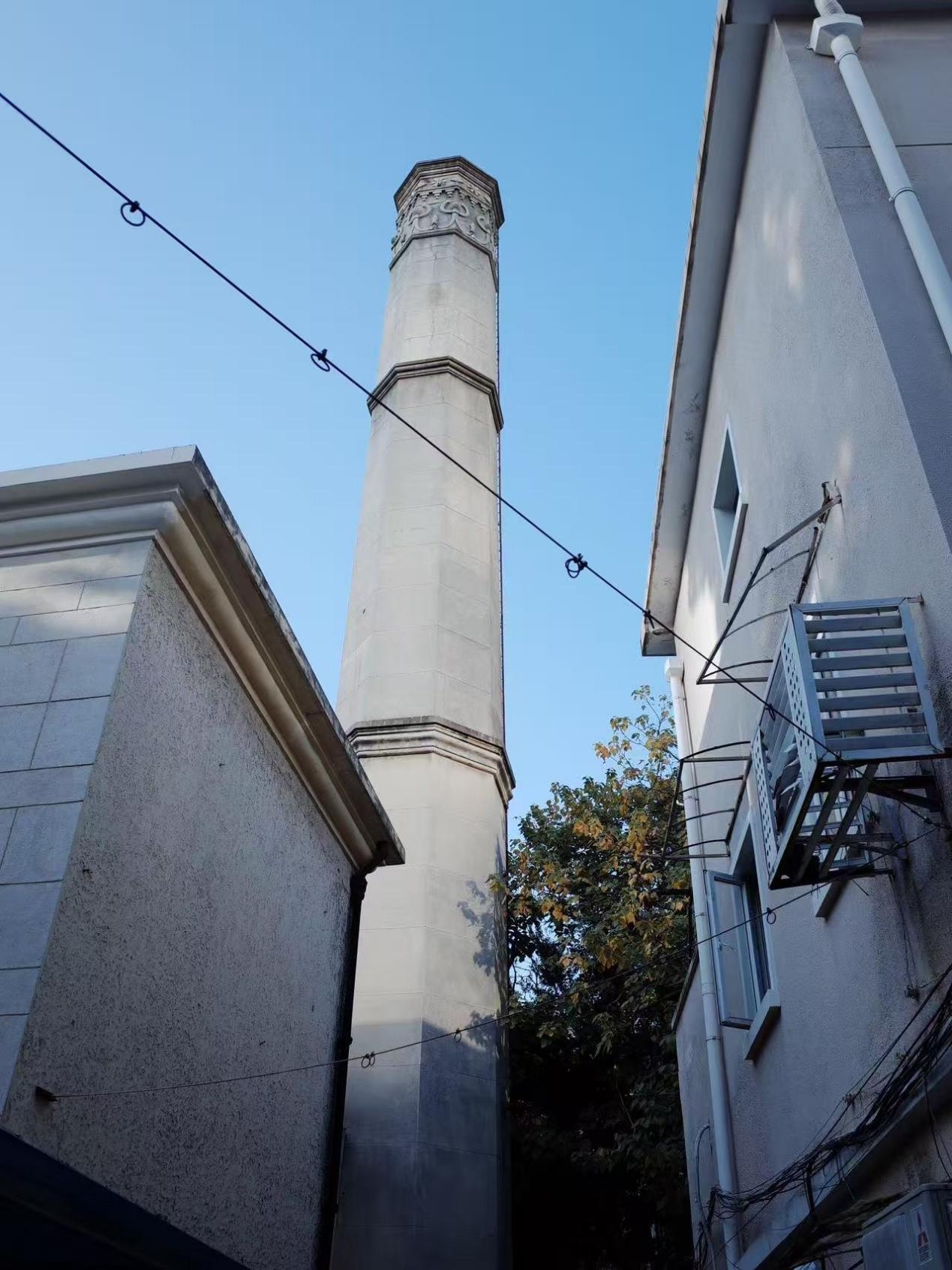 走着走着,我们迷失了方向,最后是从威海路的一个弄堂穿出来的,在这个弄堂里,我们一转头看到一根高大的八角形柱子,最上边还有精美雕花,像是某种纪念碑。我们不禁感慨:“哇,这是什么建筑?!”