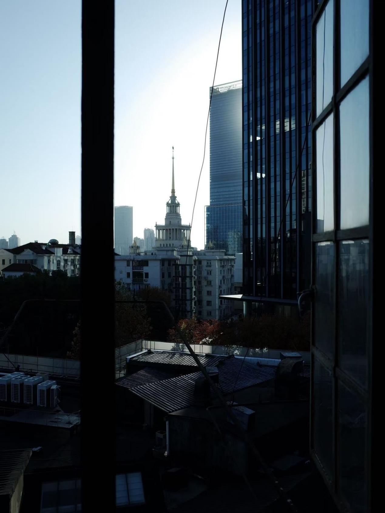 穿过马路,是平安大楼,我曾经来里面的画廊看过展,经过大门时,正好有一个快递员开门进去送货,我俩便尾随其进入了大楼。大楼共八层,我俩直接坐电梯到顶层,然后沿着楼梯间往下走。楼梯间窗外景色很特别,可以看到上海展览中心带着五角星的标志性钢塔屋顶。