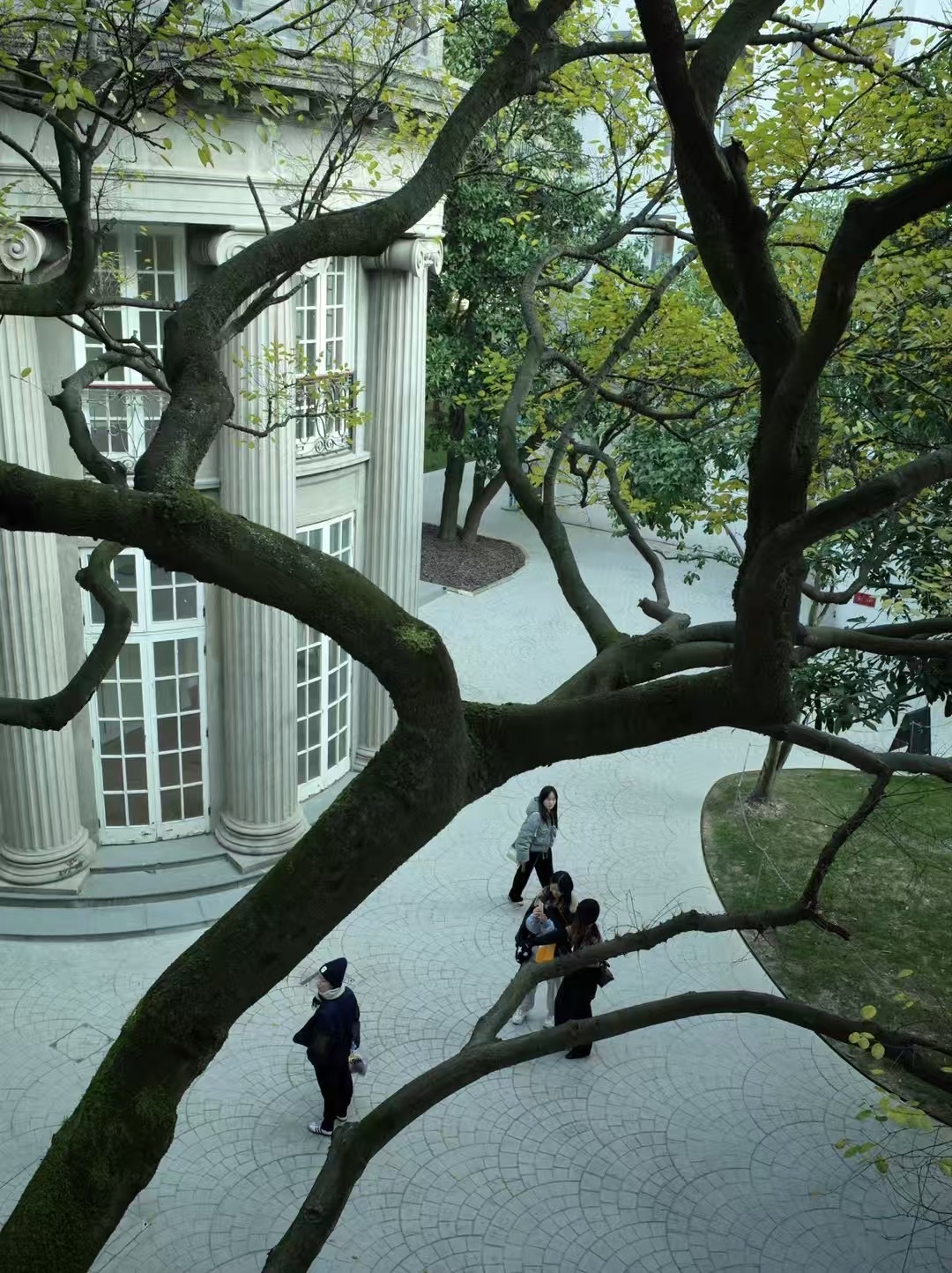 再往前就是何东旧居了,何东是当年香港首富,他在上海的寓所是知名建筑师邬达克设计的欧式洋房,建筑南面的爱奥尼克柱门廊特别气派。这里后来成为了辞书出版社,近年来何东旧居被改造成了一片艺术园区,园区里除了何东旧居外,还有许多别的新旧建筑,风格各异,却相得益彰,里面常年有各种展览,也有餐饮、咖啡馆、花店、服装店等。这里艺术气息浓厚,绿化也十分漂亮,园区内有一个大草坪,点缀其中的树木都有百年的树龄。