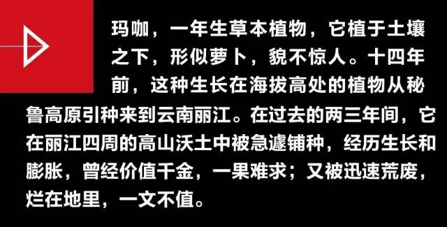 他们知道这是泡沫破了,但没人知道这是为什么。只有一些朴素的揣测:“连昆明、昭通、曲靖那样的海拔也来种玛咖,他们那也就叫萝卜。”