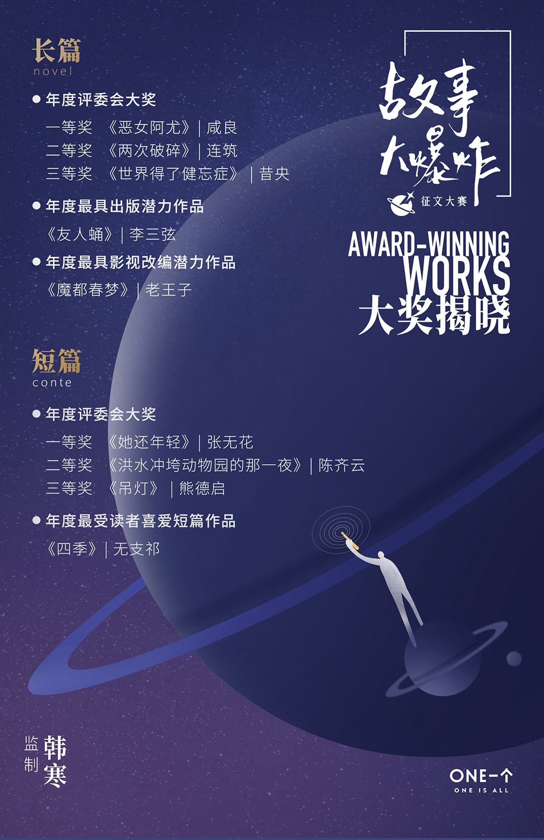 今天,我们很高兴地告诉大家:经过本届大赛评委、出版及影视公司的各位老师们严格细致地打分,加上ONE广大读者朋友们的投票——「故事大爆炸」征文大赛的结果最终出炉!