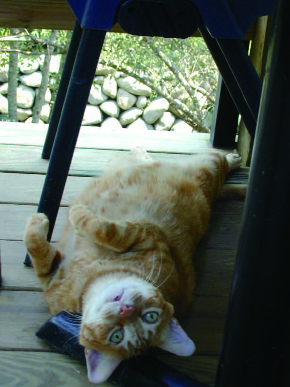 在无法确认的状况下,我只得继续观察,如此这般一个月过去,它的肚子也一天天地变大,确定它是孕妇不是产妇后,我便开始加入喂食的行列,等建立起交情,就把它带回家。回家第二天,躺在猫屋窗台上晒太阳的它,明显地看得到有小猫在肚子里滚动,第三天清晨便在我的辅助下生出五只小猫,一只白腹灰狸哥哥猫,其他全是橘、黑、白三花女生,分别以家中种植的花卉命名:桃花、桂花、樱花及杏花。产妇猫妈妈则唤它“SEVEN”,每天数次供应月子餐,猫孩子则是除了母奶,不时还辅以猫咪专用乳喂养,断奶后更是以各式营养食品帮它们打好底子,与其将来花医药费,不如在成长期下些重本,让它们有足够的抵抗力,对抗各种疾病。也因此除了桂花因先天疾病早夭外,其他四只都长得十分强壮,狂野到了一定地步。也许它们一直视我这大妈妈为同类,全然不管我有没有皮毛防身,只要我一现身,便争相扑爬到我身上,薄些的衣衫,全被它们抓成褴褛条状,腿及背上更是爪痕累累。那个夏天被它们“家暴”到完全无法穿短裙,来年冬天穿上厚外套,我便像棵圣诞树般,身上不时挂着这三四只皮到不行的花花猫。