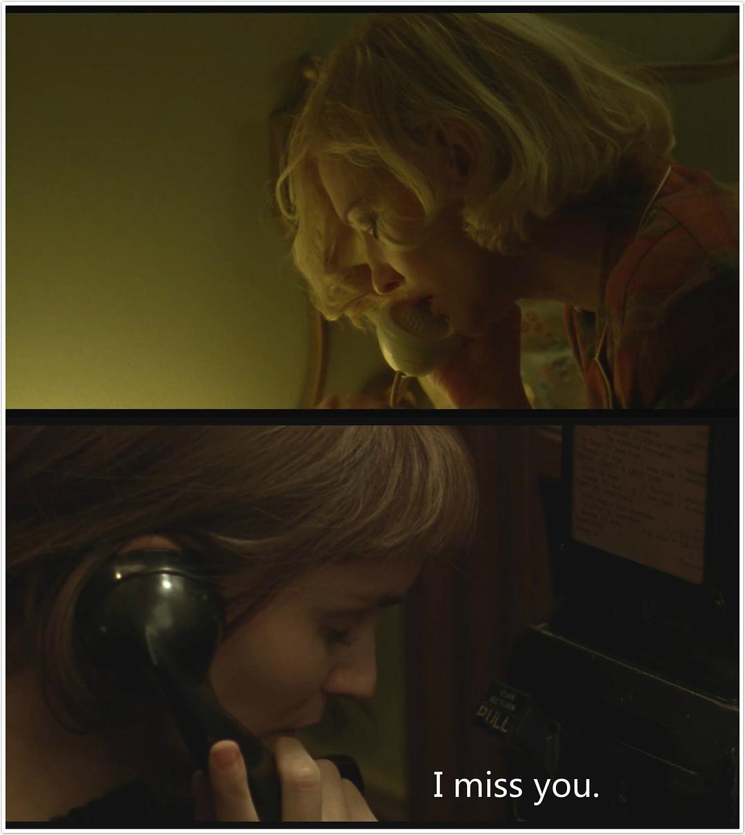 卡罗尔褪去妆容,疲惫的神色里充满自责和想念,她多想说“特芮丝,等等我”。而另一边特芮丝握着电话,却始终无法说出那句“我想你”。