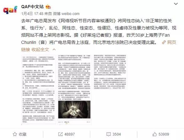 而就在今年年初(1月3日),一名30岁上海男子以通则中「针对同性恋的不恰当规定」为由,将广电总局告上法庭,而法院已决定受理此案。