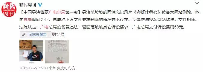 2015年,导演范坡坡因不满自己的同性恋题材纪录片《彩虹伴我心》被各视频网站删除下架,而将广电总局告上法庭。