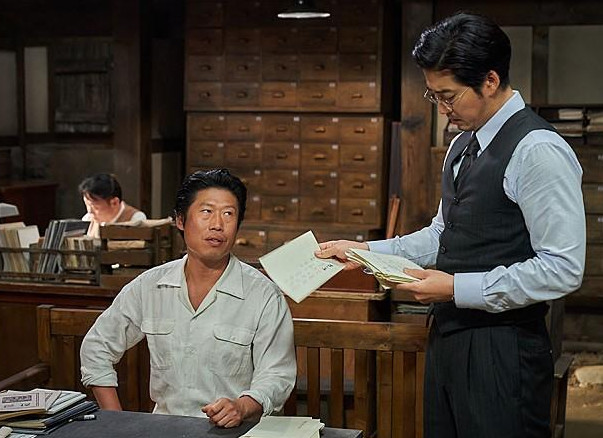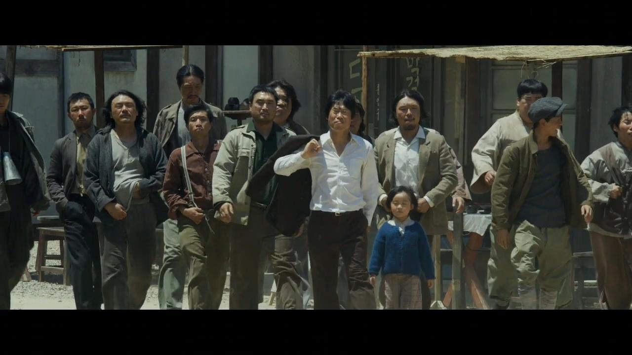 与此同时,另一个主角金判秀出身市井,有过犯罪前科,在电影院当保安,还唆使以前在监狱的兄弟混进去偷东西,然后被抓包开除。总之盲流一个。他的儿子德陈在学校因为说了朝鲜语被打,因为长期拖欠学费马上要被退学,女儿还没上小学,一家人维持基本生活都难。对于他而言,国家大义、民族精神都太遥远了,当务之急是找一个新的工作养家糊口。