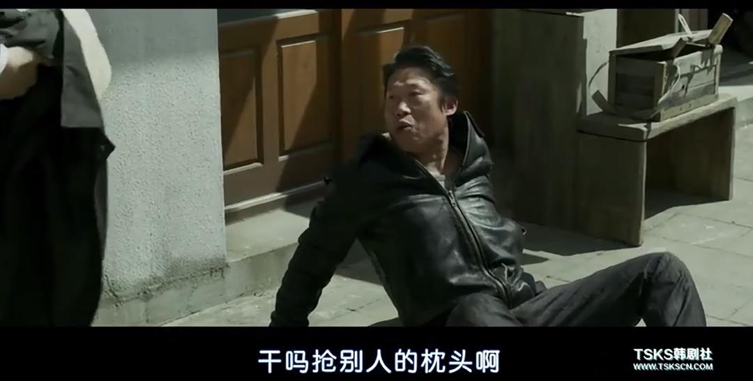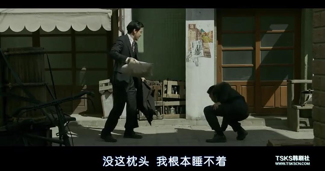 影片开头的时候,金判秀想要在火车站偷钱给儿子教学费,抢走了柳正焕的背包被狂追,于是路上他把那个装有原稿的背包掉了包,换成了一个枕头。被柳正焕追到的时候,他累得躺在地上耍无赖:“干嘛抢别人的枕头啊,没了这个枕头,我睡不好觉。”