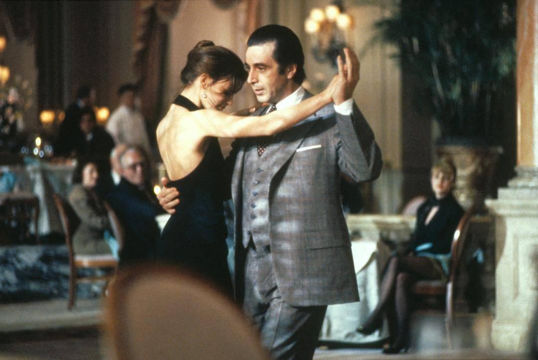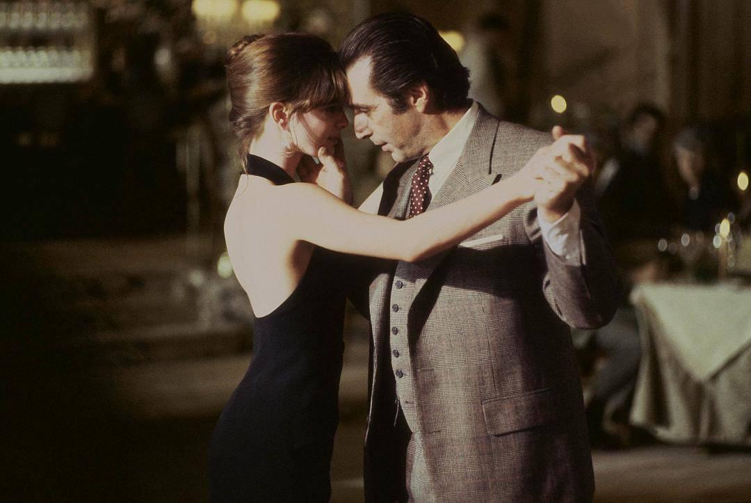 当然,《闻香识女人》最经典的一场戏,就是弗兰克在高级餐厅,与一名妙龄女子跳探戈的五分钟。没有人能淡定欣赏这短短的五分钟。它如此动人,以至于成为经典探戈舞曲《一步之遥》的代表画面,知名度甚至超越了《辛德勒的名单》中那场同样用到此曲的优雅舞会。无数人深情诠释这个片段:一曲《一步之遥》,一段最美的探戈。