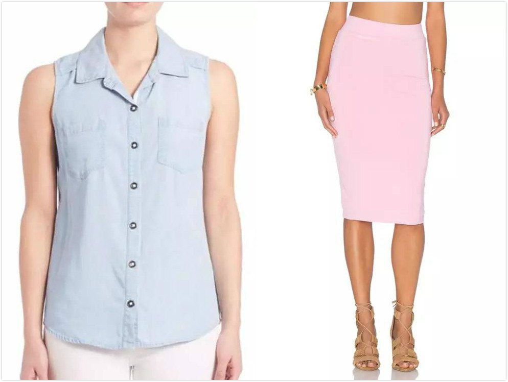 ▲蓝色牛仔背心 SPLENDID、粉色铅笔裙 BLQ BASIQ