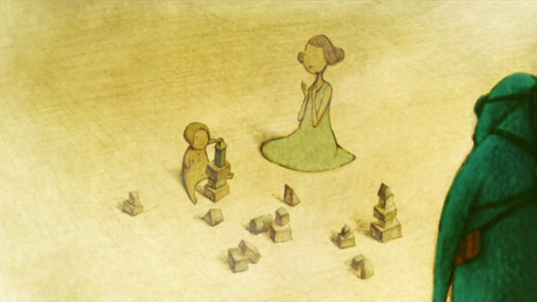 有一天,老人起床,发现水已经漫到了自己的脚边,又涨潮了,这意味着积木又得继续往上搭。