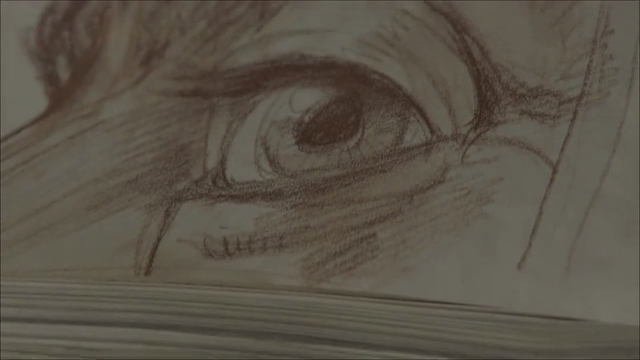 电影的开篇是一段实景,镜头扫过满满一桌的彩色铅笔和摞得老高的稿纸,最后落到了一只凶狠的眼睛上,这部电影,就是靠这些纸和笔一张一张画出来的,而它要表达的,则是那只眼睛透露出来的凶残。