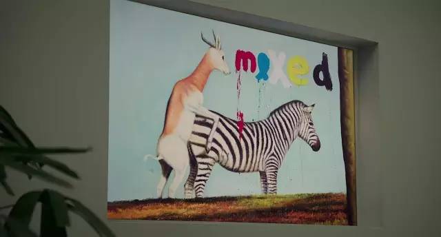 家中墙壁挂的画,一只雄鹿在跟一匹斑马玩游戏: