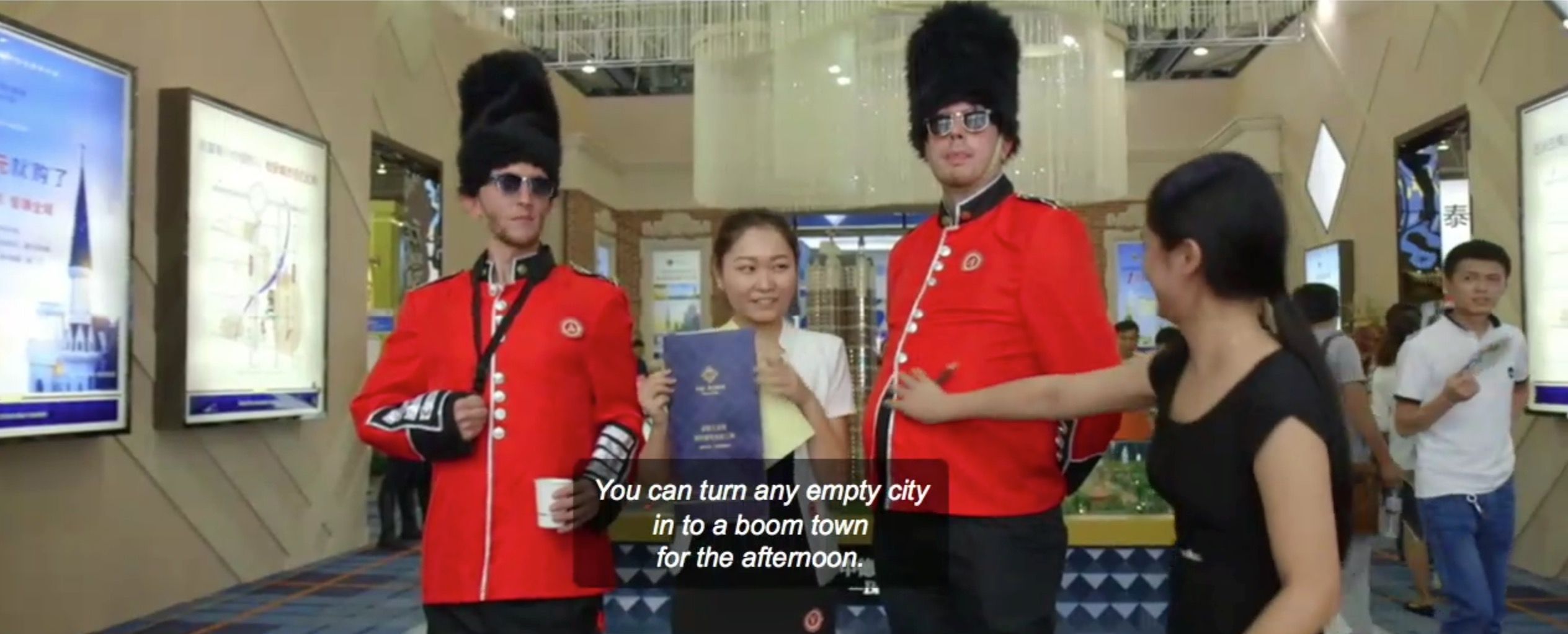 但在三四线城市,房价没这么高,卖房子也没这么容易。开发商们得花式营销。比如,雇一批老外模特,到开盘仪式上站台、表演,让那些地处荒郊野外的楼盘,摇身一变成为国际范儿豪华社区,再高价卖出。