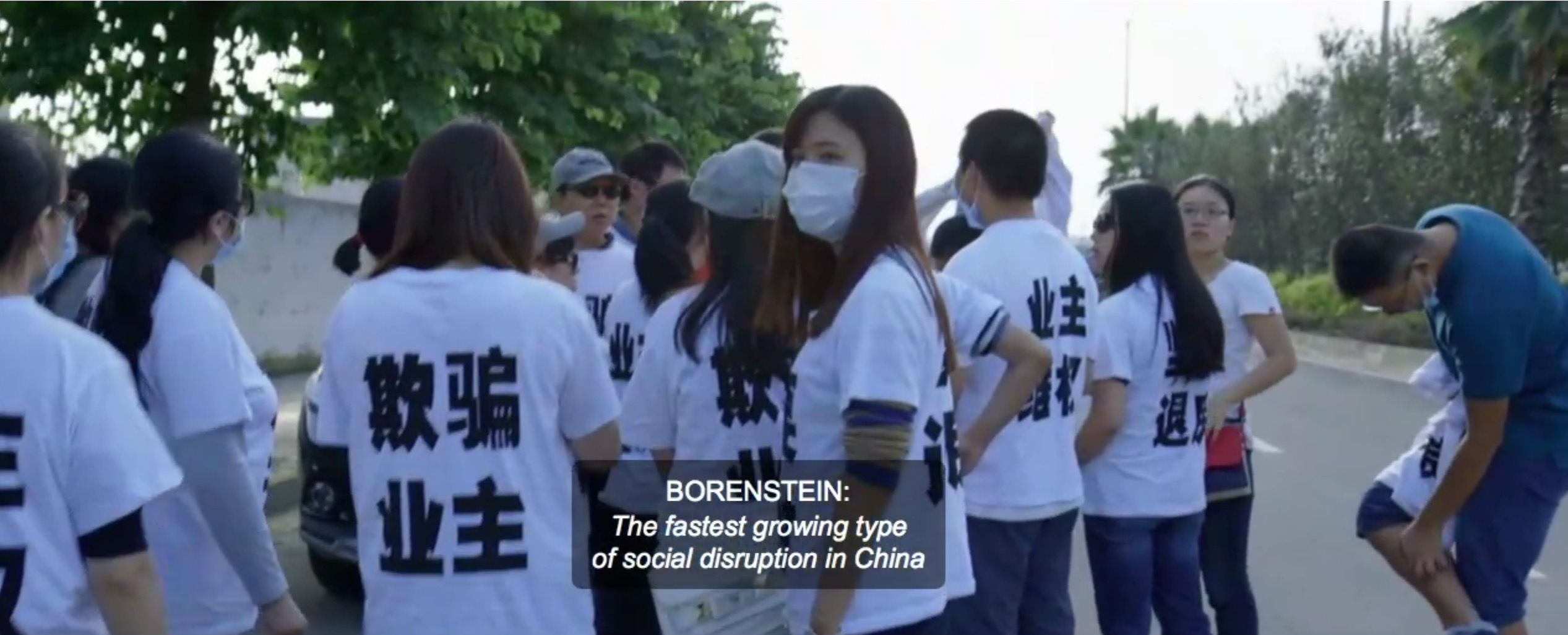 业主们戴着口罩,聚集到小区门口抗议。他们终于意识到自己被虚假宣传骗了。“他们宣传的是……那边都是外国人住的高端社区,但是现在看来根本不是那么回事儿。”一位业主对着大卫的镜头说。