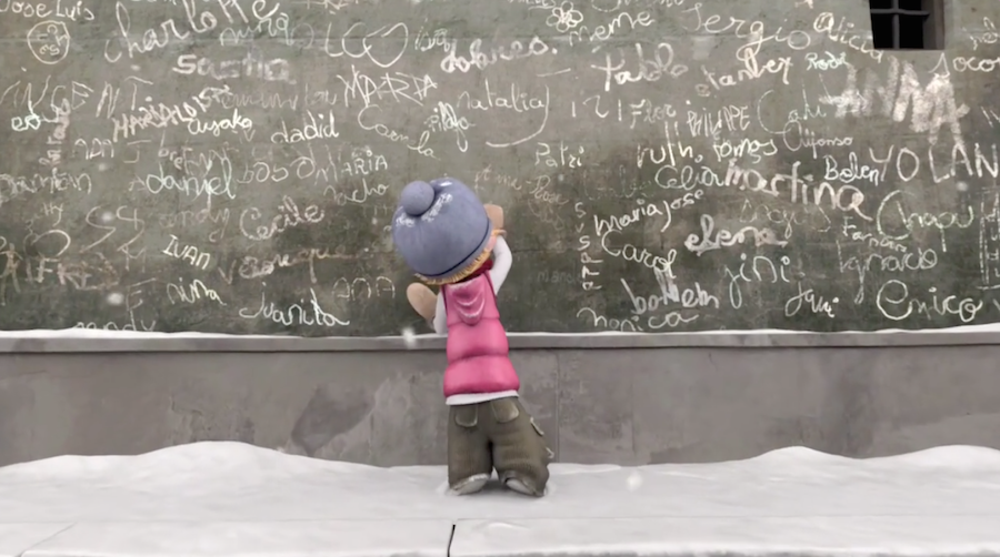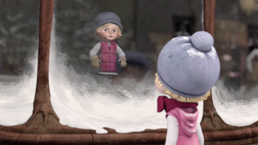 小女孩一转身,被橱窗里跟自己一模一样的玩偶吸引住了,等她定睛再看,娃娃从橱窗展示台跑到了店铺中间的桌子上,她推不开门,生气地砸了个雪球转身就走,门吱呀一声在身后打开了。