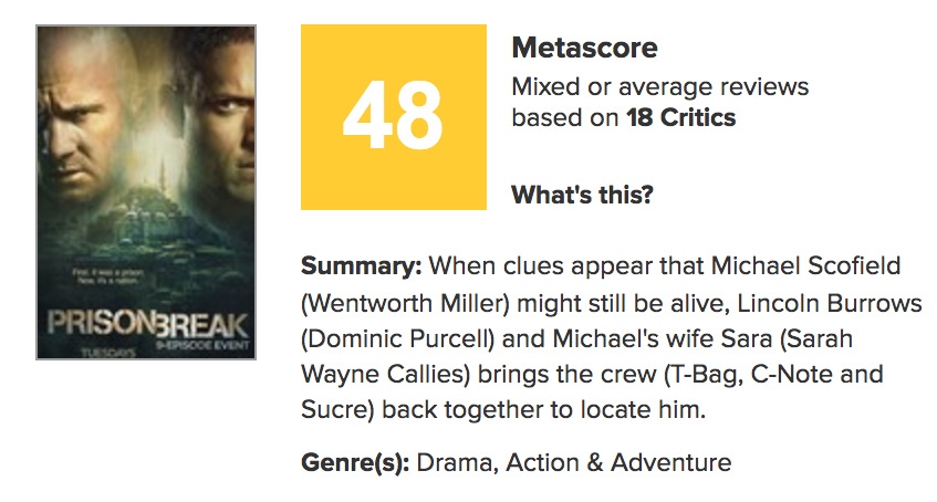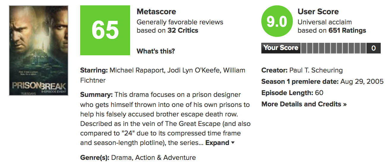 到第四季,只有区区五家媒体给《越狱》打了分,平均分仅为61分。更令人难过的是普通观众的倒戈,198位用户在Meta上打分,平均分只有5.4(第一季为9.0),比媒体还狠。