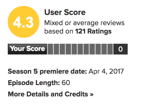 豆瓣上,目前有2000多位观众为第五季打分,分数是变态的9.4,与Meta上由121位普通观众打出的4.3分相比,一个天上一个地下。难道两国观众看的不是同一个剧吗?
