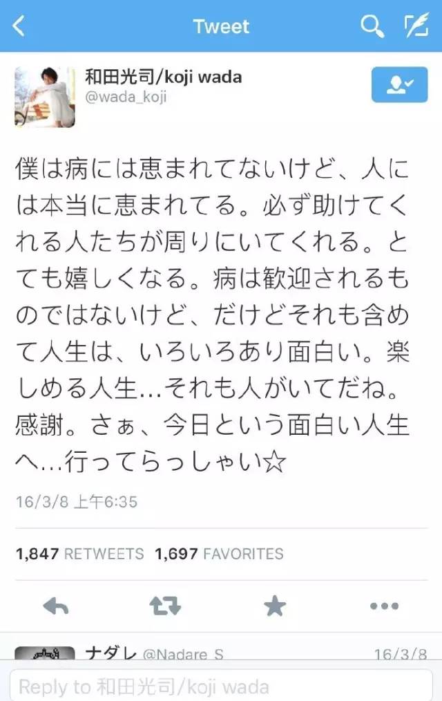翻译:我虽然倍受病痛的折磨,但是也备受大家的关照,身边总是有给予我帮助的人。我真的非常开心。虽然没有人会想要生病,但是包含这一切的人生还是非常有趣的啊。因为有大家的存在,这也算是非常让人享受的一生了。感谢。好,今天也要奔向这样有趣的人生啊~~~