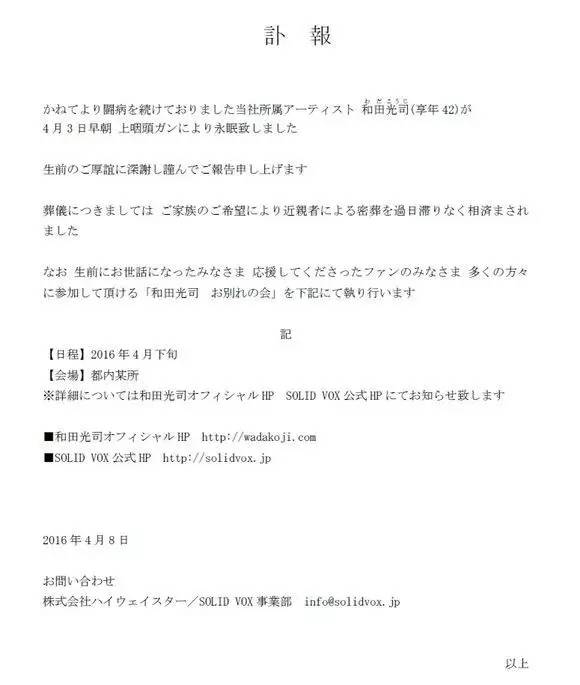 2011年癌症复发,和田不得不再次休养,2013年在Twitter宣布再次复出。他的后半生一直在和咽癌斗争,一度因此差点与演艺生涯诀别,顽强的生命力让他被称作“不死蝶动漫歌手”。